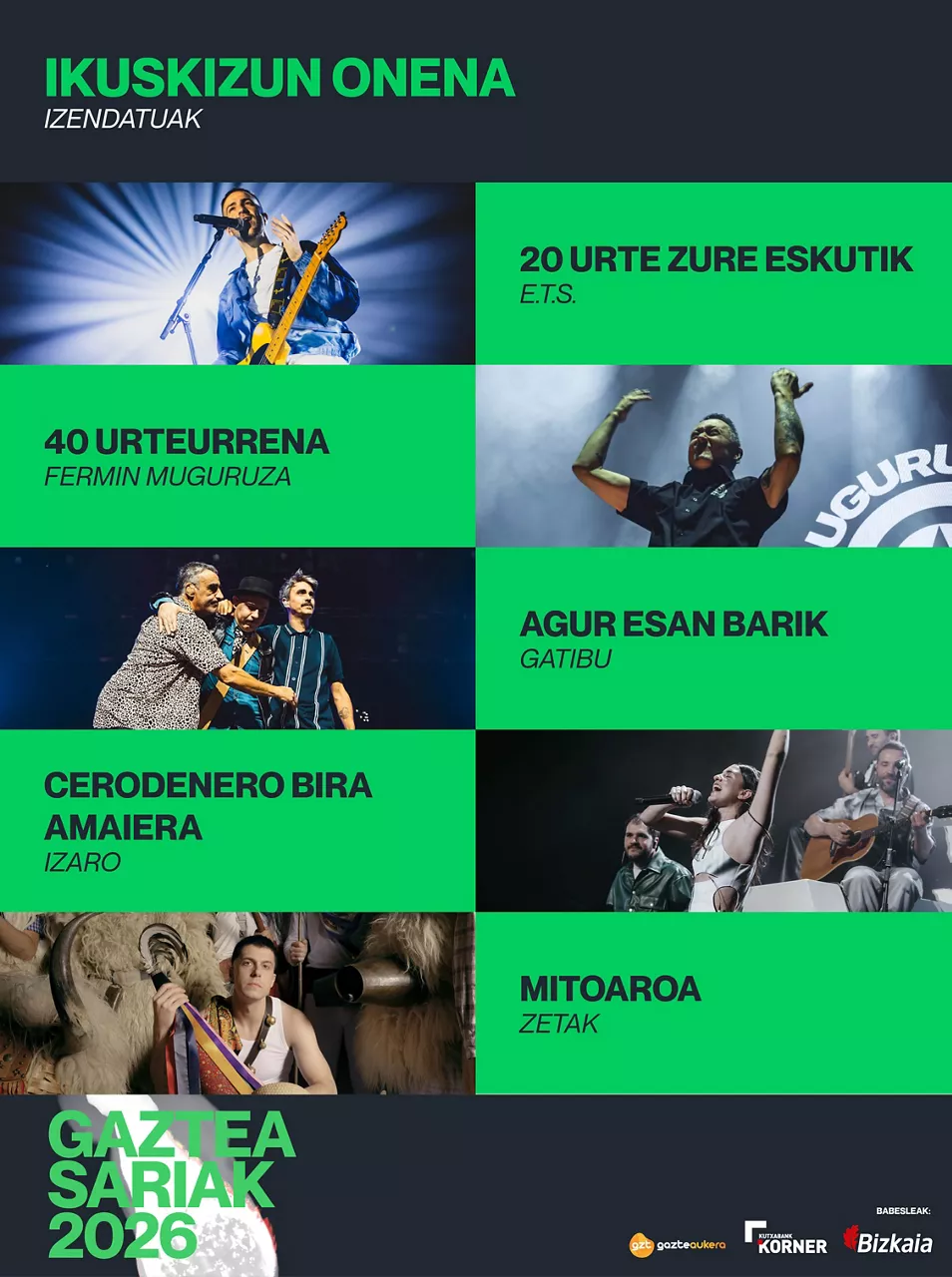 Gure musikak 2025an emandakoa omendu eta saritzeaz gain, zuzeneko emanaldiz jositako sekulako festa prestatu dugu aurtengo ediziorako.