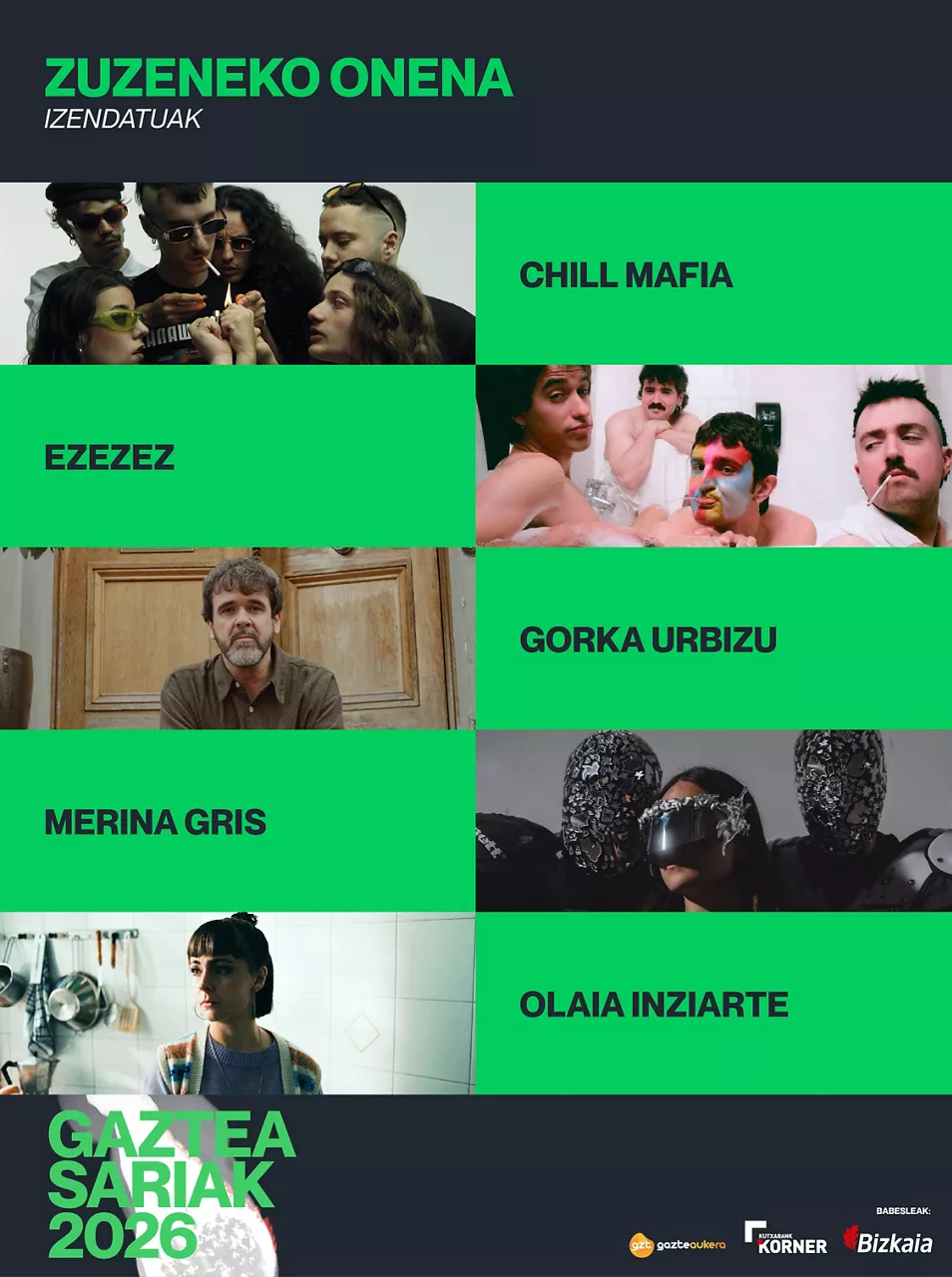 Zuzeneko onenaren Gaztea Saria eskuratzeko hautagaiak Merina Gris, Chill Mafia, Olaia Inziarte, EZEZEZ eta Gorka Urbizu dira. 2025a denentzat izan da berezia, eta Euskal Herriko zein gure mugetatik kanpoko oholtzetan aritu dira, ia gelditu gabe. Chill Mafiaren kasuan, taldea utzi aurreko despedida kontzertuak eman zituzten 2025 hasieran.